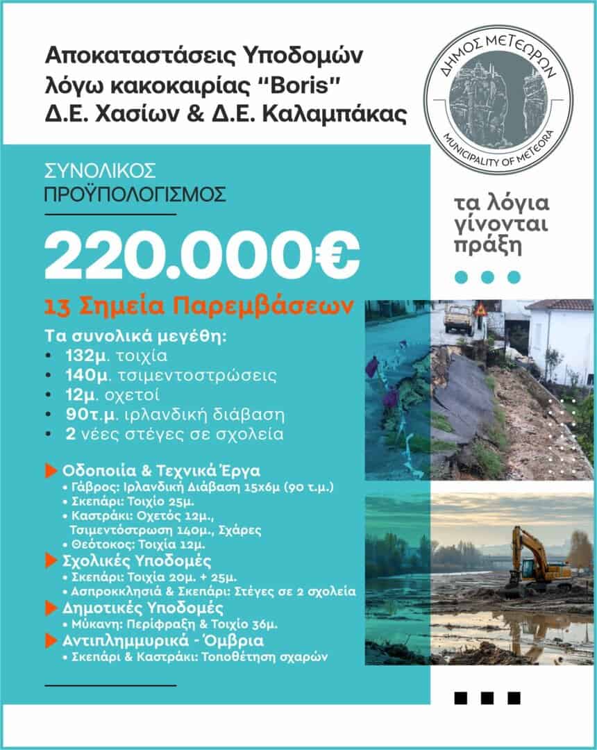 Ο Δήμος Μετεώρων ξεκινά δυναμικά 13 σημαντικές παρεμβάσεις για την αποκατάσταση και ενίσχυση των υποδομών που επλήγησαν από την κακοκαιρία «Boris». Ο Δήμαρχος, Λευτέρης Αβραμόπουλος, υπέγραψε τη σχετική σύμβαση για έργα συνολικού προϋπολογισμού 220.000 €, με χρηματοδότηση από το Υπουργείο Εσωτερικών, επιβεβαιώνοντας τη δέσμευση της δημοτικής αρχής για ασφαλείς και λειτουργικές τοπικές κοινότητες. Τα έργα θα υλοποιηθούν σε τοπικές κοινότητες των Δημοτικών Ενοτήτων Χασίων και Καλαμπάκας, συγκεκριμένα στα χωριά: Γάβρος, Σκεπάρι, Καστράκι, Θεότοκος, Ασπροκκλησιά και στον περιβάλλοντα χώρο του πρώην Δημαρχείου Χασίων στο 11.500. Οι παρεμβάσεις καλύπτουν οδοποιία, σχολικές και δημοτικές υποδομές, καθώς και αντιπλημμυρικά έργα.