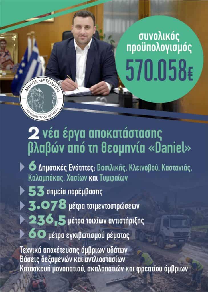 Παράλληλα, σε εξέλιξη βρίσκεται και η αποκατάσταση ζημιάς στο εξωτερικό δίκτυο ύδρευσης από την περιοχή της Ασβεσταριάς προς το κεντρικό δίκτυο στο Μεσοχώρι. Για την κάλυψη των αναγκών έχει ήδη δοθεί προσωρινή αποκατάσταση, ενώ συνεχίζονται οι εργασίες για την οριστική αποκατάσταση του αγωγού. Οι ζημιές αυτές προκλήθηκαν από τις έντονες πλημμύρες που σημειώθηκαν τον Νοέμβριο του 2025 στην περιοχή. Οι εργασίες αποκατάστασης υλοποιούνται με τη στενή συνεργασία του Προέδρου της Τοπικής Κοινότητας, κ. Νίκου Σωτηρίου, και των συνεργείων της ΔΕΥΑ Μετεώρων, τα οποία εργάζονται εντατικά για την αποκατάσταση των ζημιών και την επαναφορά της ομαλής λειτουργίας του δικτύου.