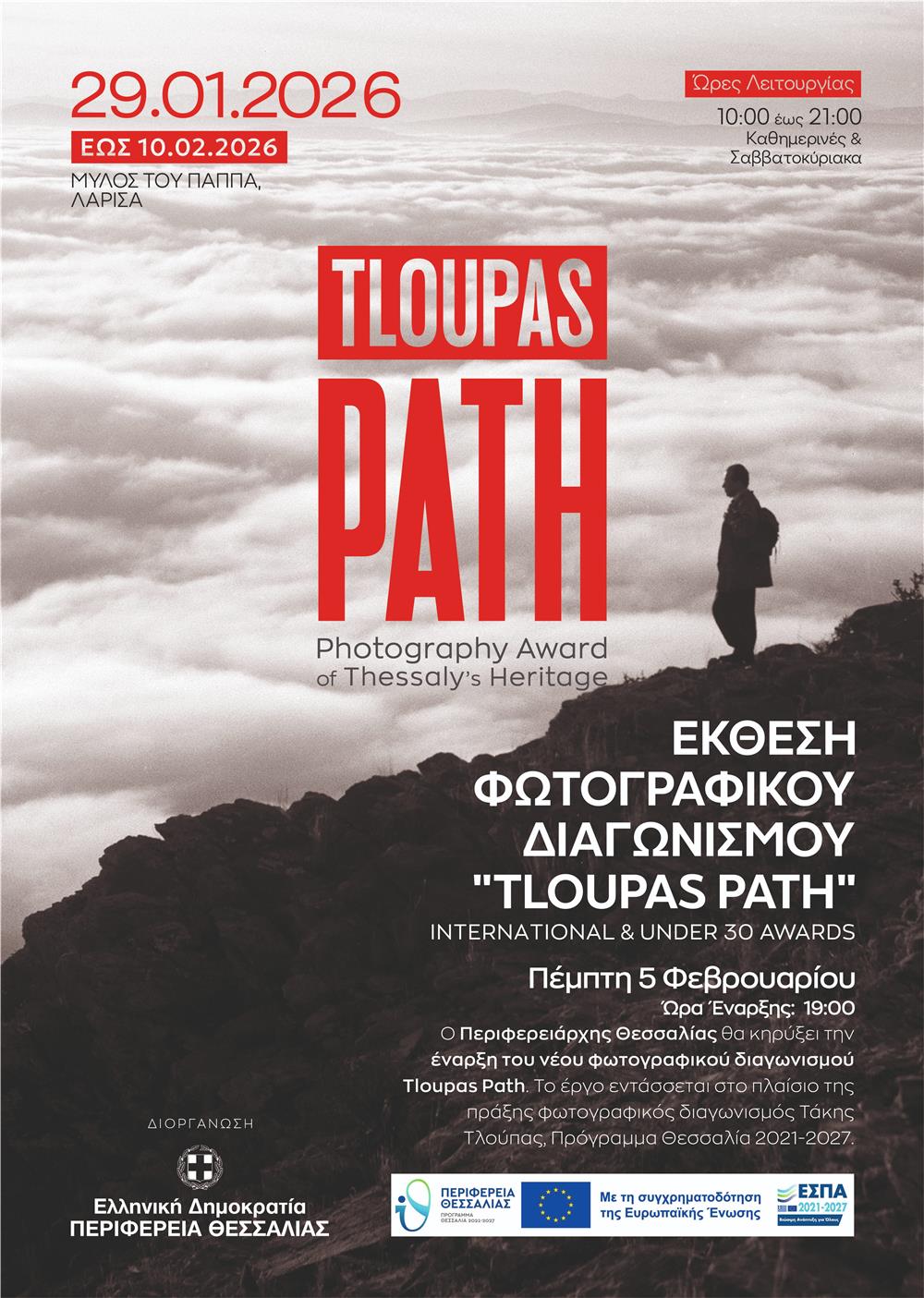 Η Περιφέρεια Θεσσαλίας ανοίγει την έκθεση φωτογραφίας Tloupas PATH – Photography Award of Thessaly’s Heritage, όπου παρουσιάζει τα έργα που διακρίθηκαν στους δύο ετήσιους διαγωνισμούς του θεσμού, στο TLOUPAS PATH INTERNATIONAL AWARD και στο TLOUPAS PATH UNDER 30 AWARD 2025. Στην έκθεση εκτίθεται μία ολοκληρωμένη σειρά φωτογραφιών των νικητών των δύο διαγωνισμών καθώς και αντιπροσωπευτικές φωτογραφίες των καλλιτεχνών που μπήκαν στη βραχεία λίστα. Η Περιφέρεια Θεσσαλίας με αυτόν τον τρόπο φέρνει σε δημιουργικό διάλογο καταξιωμένους αλλά και νεότερους φωτογράφους με τη φωτογραφική κληρονομιά της Θεσσαλίας μέσα από σύγχρονες οπτικές προσεγγίσεις.