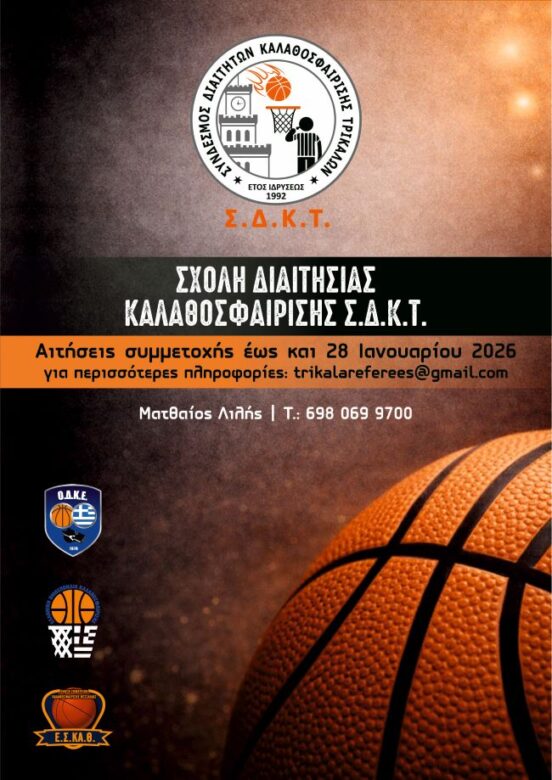 23 Ιαν Αθλητικά, Θεσσαλία Δημιουργία Νέας Σχολής Διαιτητών Καλαθοσφαίρισης στα Τρίκαλα Posted by efi 23 Ιανουαρίου, 2026 Ο Σύνδεσμος Διαιτητών Καλαθοσφαίρισης Τρικάλων ανακοινώνει τη δημιουργία νέας Σχολής Διαιτητών Καλαθοσφαίρισης, η οποία πρόκειται να ξε... Διαβάστε Περισσότερα