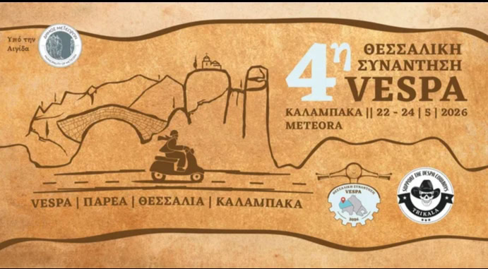 Η Καλαμπάκα ετοιμάζεται να υποδεχθεί την 4η Θεσσαλική Συνάντηση Vespa από τις 22 έως τις 24 Μαΐου 2026. Ένα τριήμερο αφιερωμένο στη θρυ...