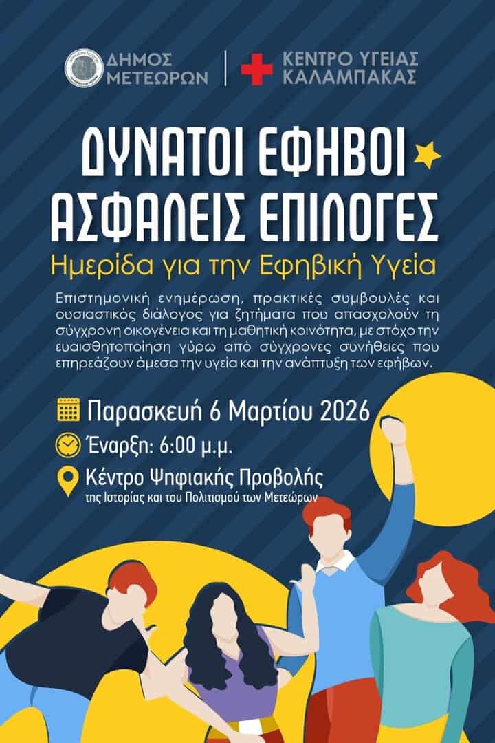 Με πρωτοβουλία του Δήμου Μετεώρων και του Κέντρου Υγείας Καλαμπάκας, διοργανώνεται μια σημαντική ημερίδα αφιερωμένη στην εφηβική υγεία,...