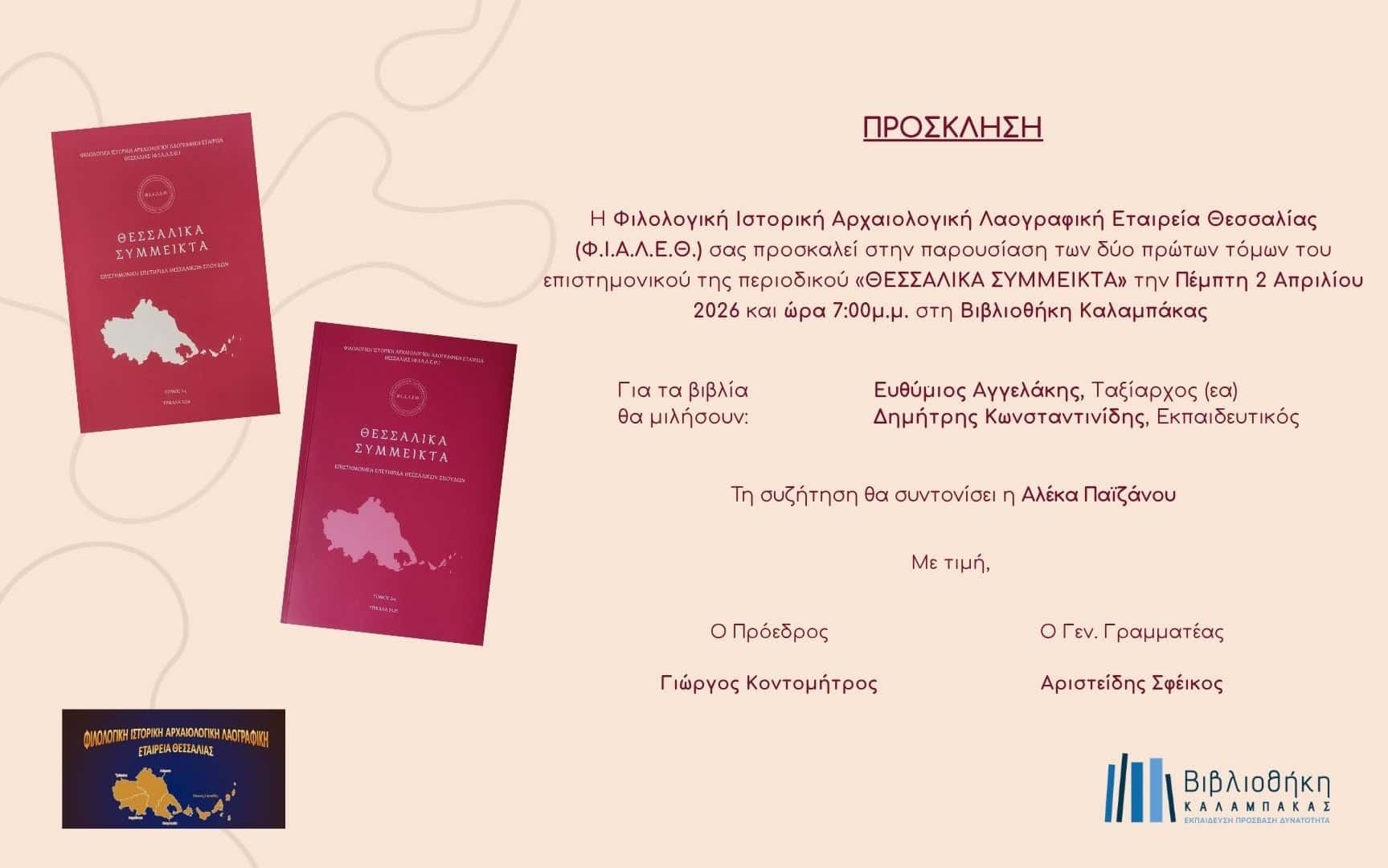 Βιβλιοθήκη Καλαμπάκας: Η Φιλολογική Ιστορική Αρχαιολογική Λαογραφική Εταιρεία Θεσσαλίας παρουσιάζει το νέο επιστημονικό περιοδικό «ΘΕΣΣΑΛΙΚΑ ΣΥΜΜΕΙΚΤΑ»