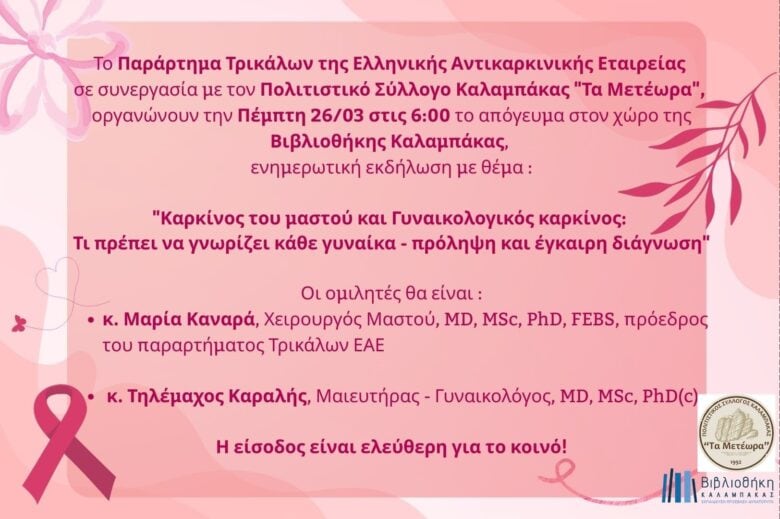 Βιβλιοθήκη Καλαμπάκας: Ενημερωτική εκδήλωση από την Αντικαρκινική Εταιρεία Τρικάλων και τον Πολιτιστικό Σύλλογο «Τα Μετέωρα»
