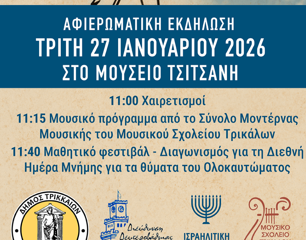 22 Ιαν Θεσσαλία Posted by efi 22 Ιανουαρίου, 2026 Αφιερωματική εκδήλωση για την Παγκόσμια Ημέρα Ολοκαυτώματος και την Εθνική Ημέρα Μνήμης Ελλήνων Εβραίων Μαρτύρων Ηρώων Θυμάτων του Ολοκ... Διαβάστε Περισσότερα