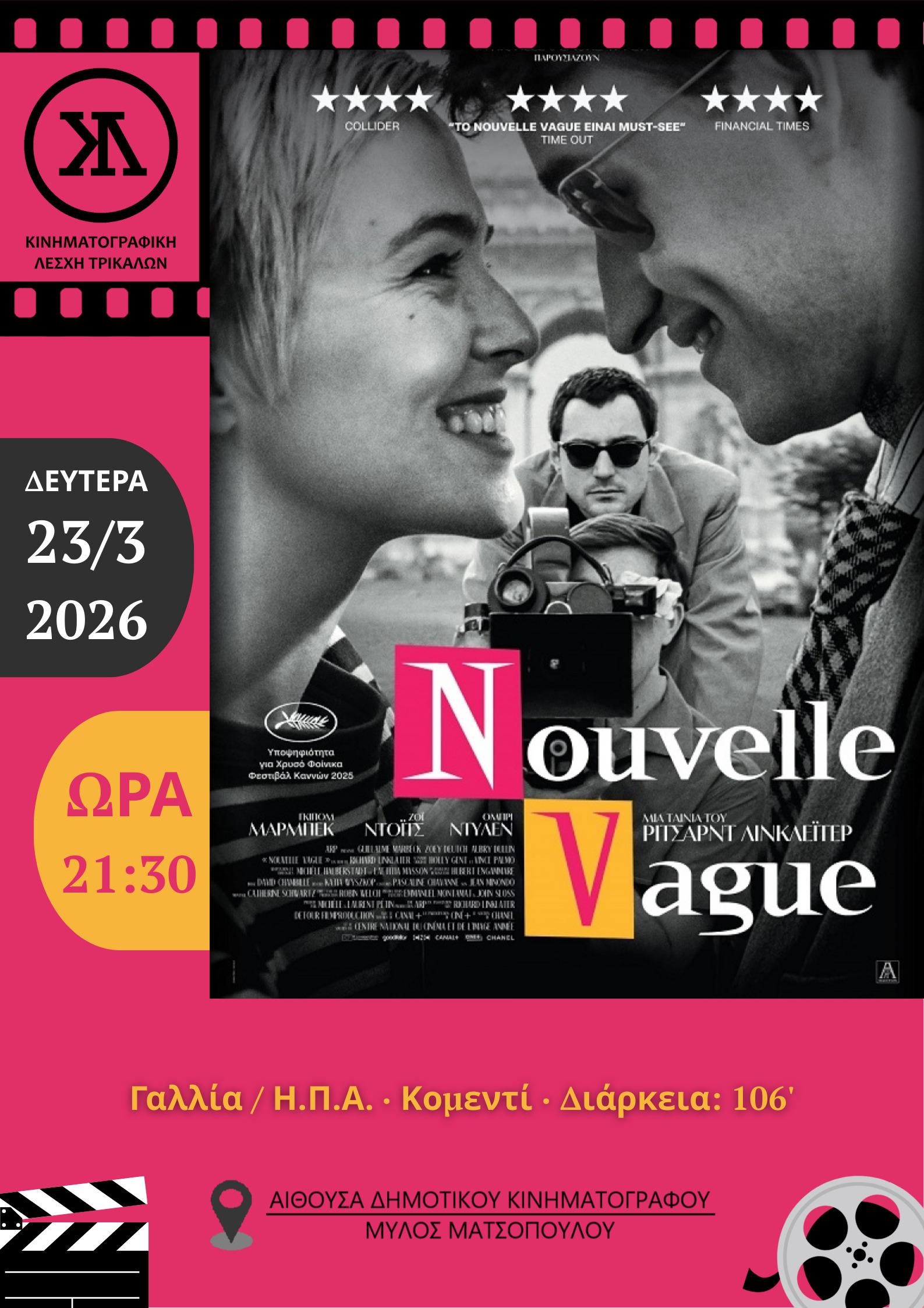 Μια κομεντί – ωδή στον Γκοντάρ και στη γέννηση του γαλλικού «Νέου Κύματος» προβάλει η Κινηματογραφική Λέσχη Τρικάλων. Πρόκειται για την ταινία «Nouvelle Vague» που θα προβληθεί τη Δευτέρα 23 Μαρτίου 2026, στην αίθουσα του Δημοτικού Κινηματογράφου Τρικάλων.