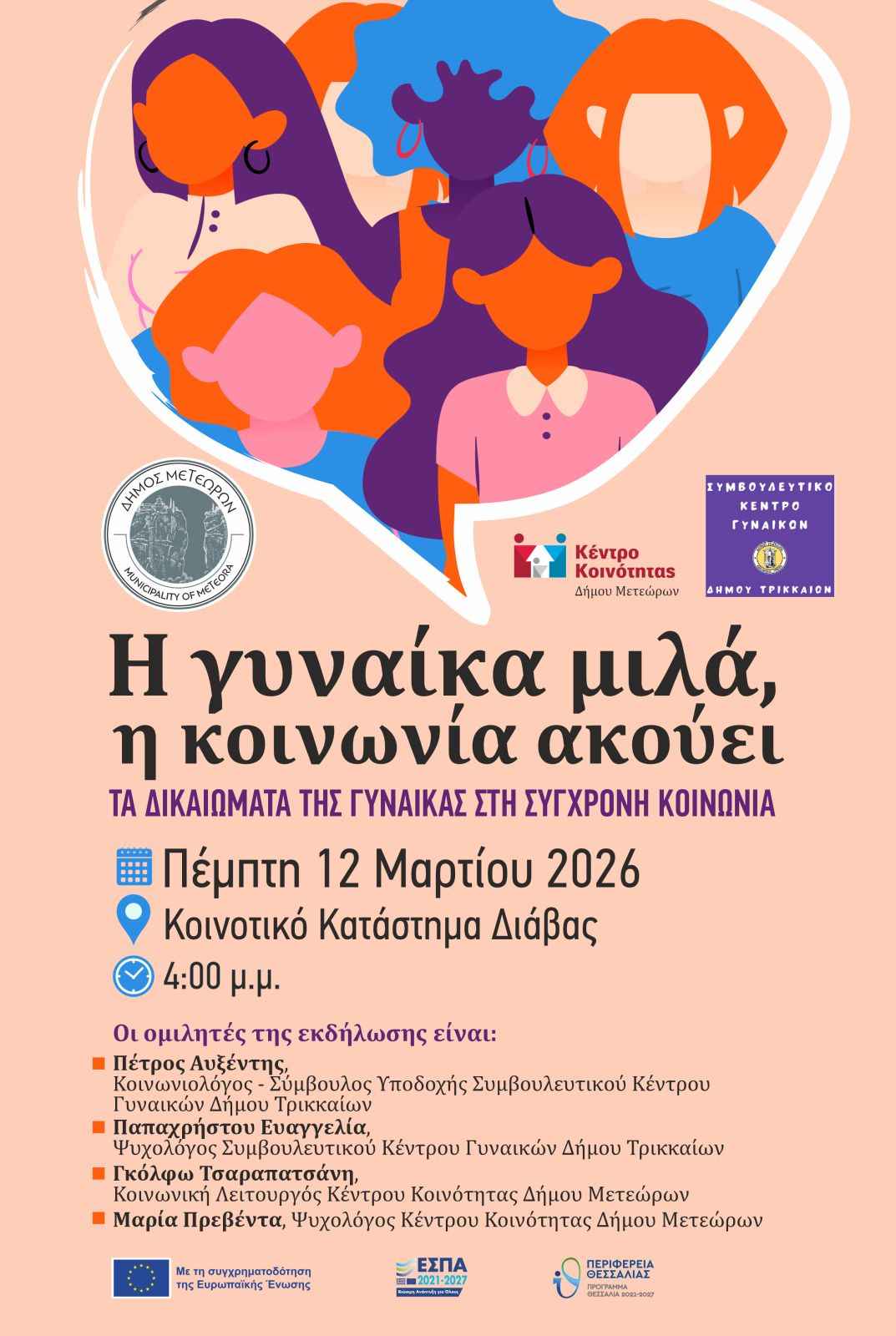 Το Κέντρο Κοινότητας του Δήμου Μετεώρων, σε συνδιοργάνωση με το Συμβουλευτικό Κέντρο Γυναικών Τρικάλων, με αφορμή την Παγκόσμια Ημέρα της Γυναίκας (8 Μαρτίου),  σας προσκαλούν στην εκδήλωση με θέμα: