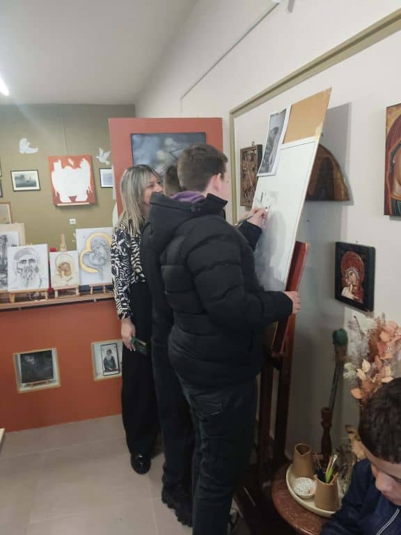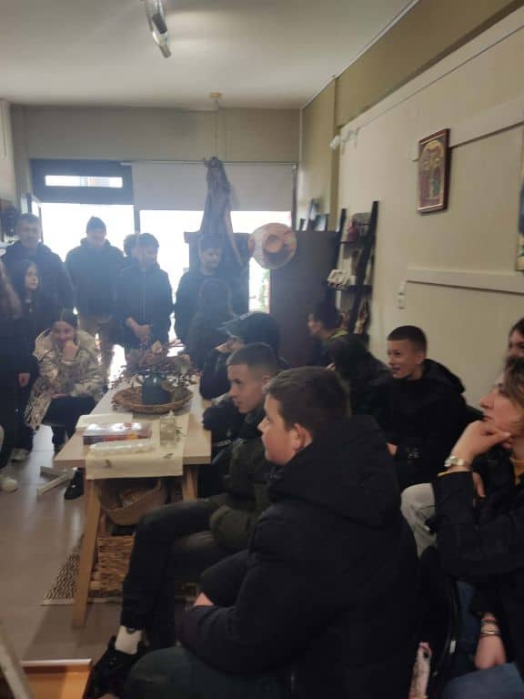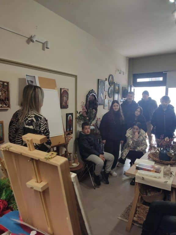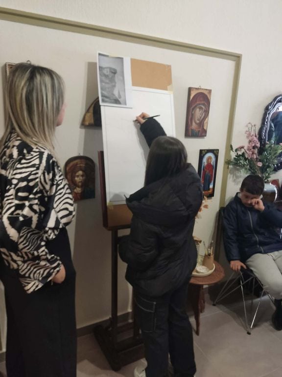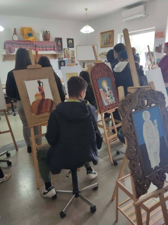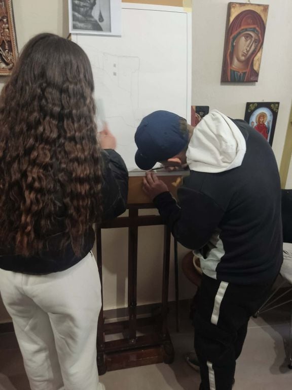 Στη συνέχεια, στο εργαστήρι αγιογραφίας της κας Καραγγέλη, οι μαθητές γνώρισαν την τέχνη της αγιογραφίας, τις τεχνικές και τα υλικά που χρησιμοποιούνται, καθώς και τη βαθύτερη πνευματική διάσταση της δημιουργίας των εικόνων. Η παρουσίαση ήταν άκρως βιωματική και προκάλεσε το έντονο ενδιαφέρον όλων.