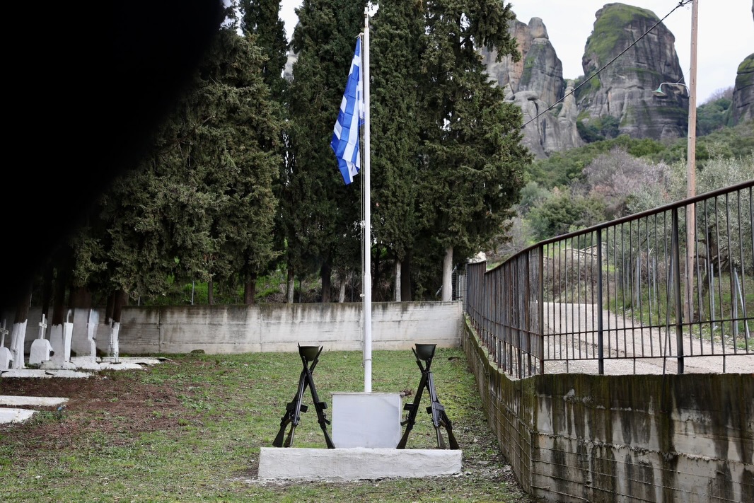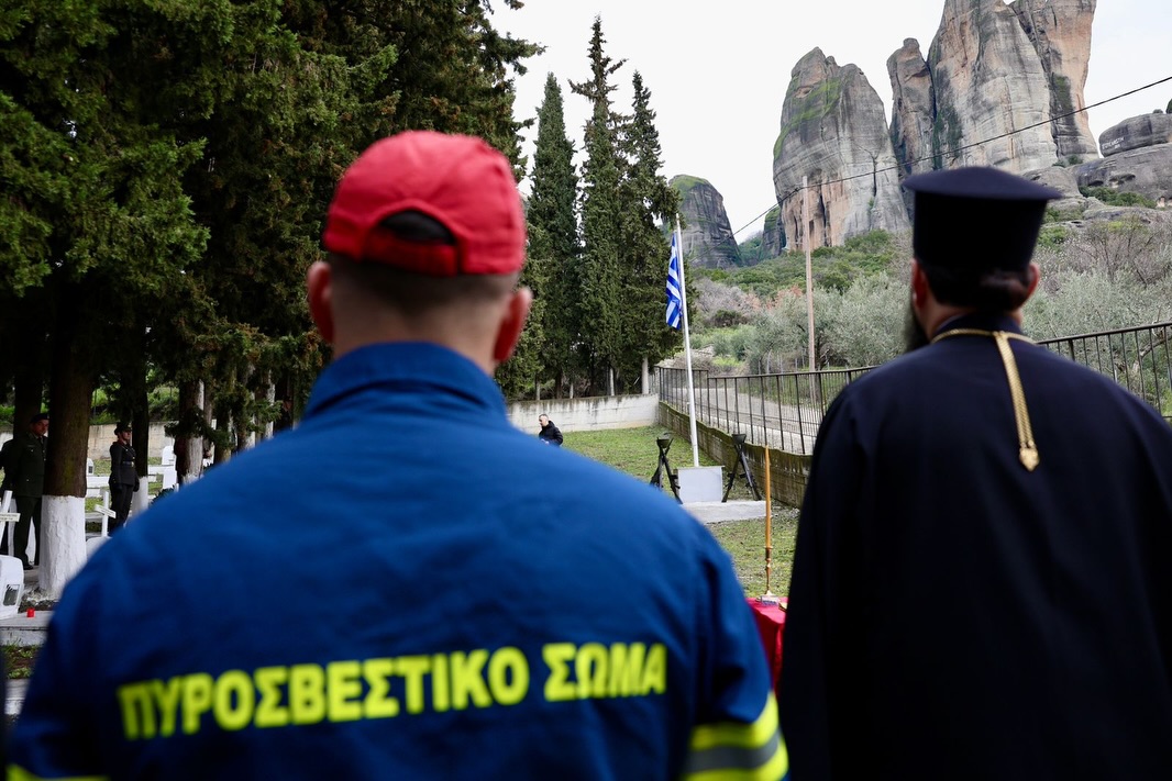 Η σεμνή τελετή ολοκληρώθηκε με την κατάθεση στεφάνων και την ανάκρουση του Εθνικού Ύμνου κάτω από τον ιερό βράχο των Μετεώρων.
