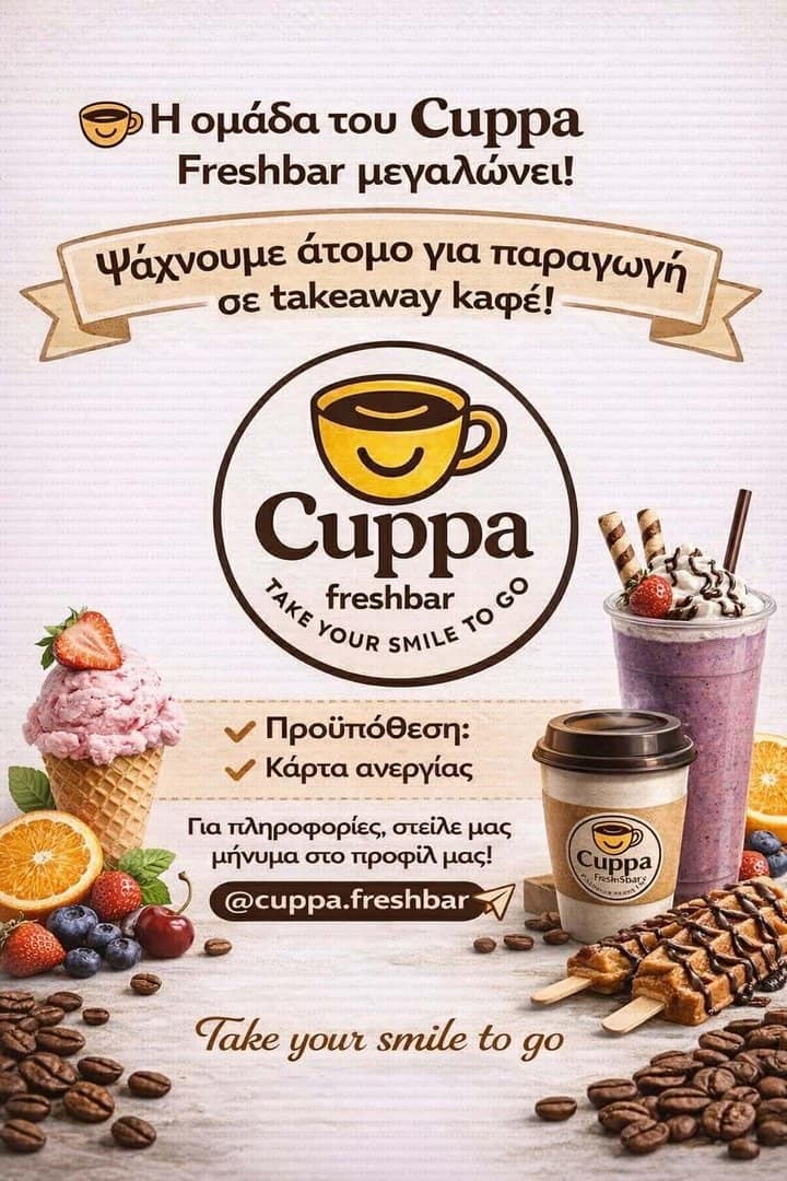 Το Cuppa Freshbar, το αγαπημένο στέκι της Καλαμπάκας που έχει συνδέσει το όνομά του με τον ποιοτικό καφέ και το θετικό vibe, ανακοίνωσε ότι ανοίγει μια νέα θέση εργασίας, προσκαλώντας ενδιαφερόμενους να ενταχθούν στη δυναμική του ομάδα.