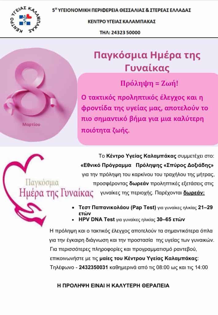 Το Κέντρο Υγείας Καλαμπάκας, στο πλαίσιο της Παγκόσμιας Ημέρας της Γυναίκας, συμμετέχει ενεργά στο Εθνικό Πρόγραμμα Πρόληψης «Σπύρος Δοξιάδης» για την καταπολέμηση του καρκίνου του τραχήλου της μήτρας.