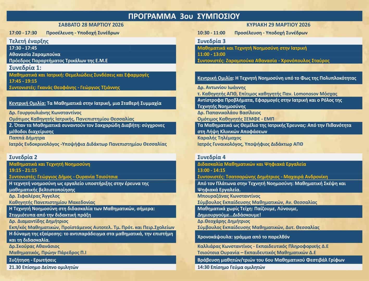 «Μαθηματικά και Ιατρική:Διδακτικές πρακτικές και εργαλεία στην εποχή της Τεχνητής Νοημοσύνης», το οποίο θα πραγματοποιηθεί στις 28 και 29 Μαρτίου 2026 στα Τρίκαλα, στην Στέγη Λαϊκού Πολιτισμού, Πινακοθήκη Θ.Μάρκελλου – Μ.Καταφυγιώτη, Γαριβάλδη 8, Τρίκαλα.