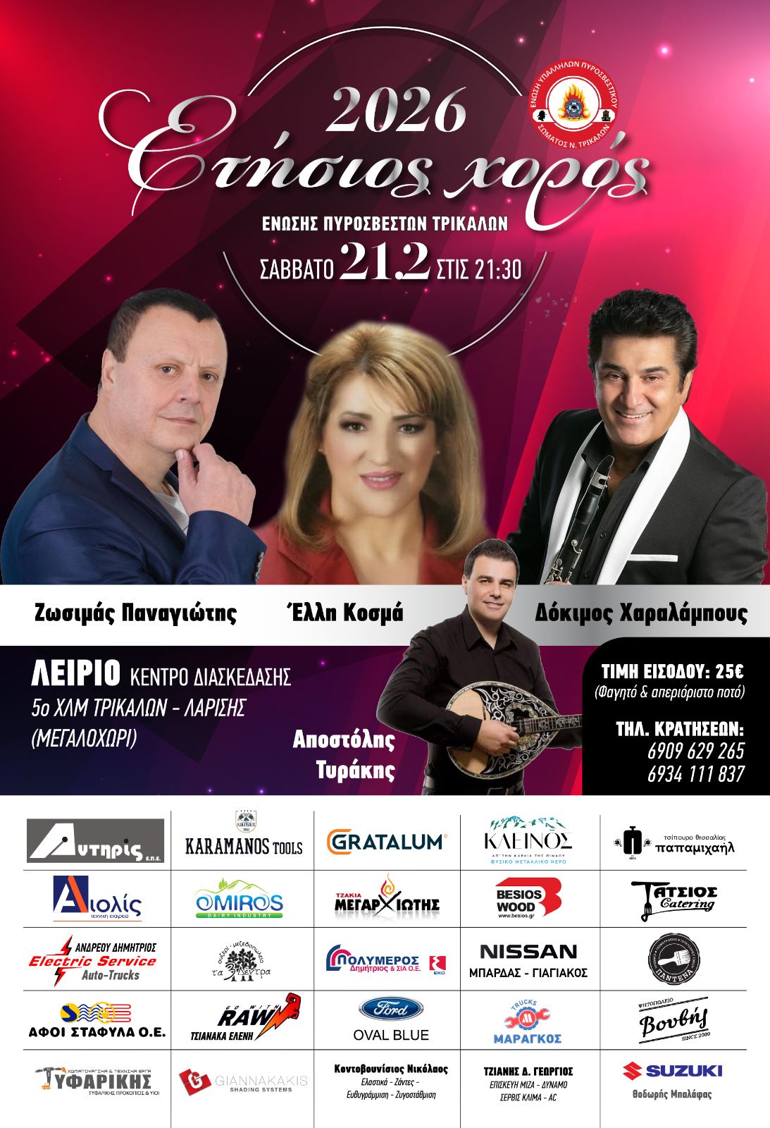 Το Διοικητικό Συμβούλιο της Ένωσης προσκαλεί όλους τους πολίτες των Τρικάλων να τιμήσουν με την παρουσία τους την εκδήλωση, ενισχύοντας το έργο των πυροσβεστών και απολαμβάνοντας μια βραδιά γεμάτη χορό και τραγούδι.