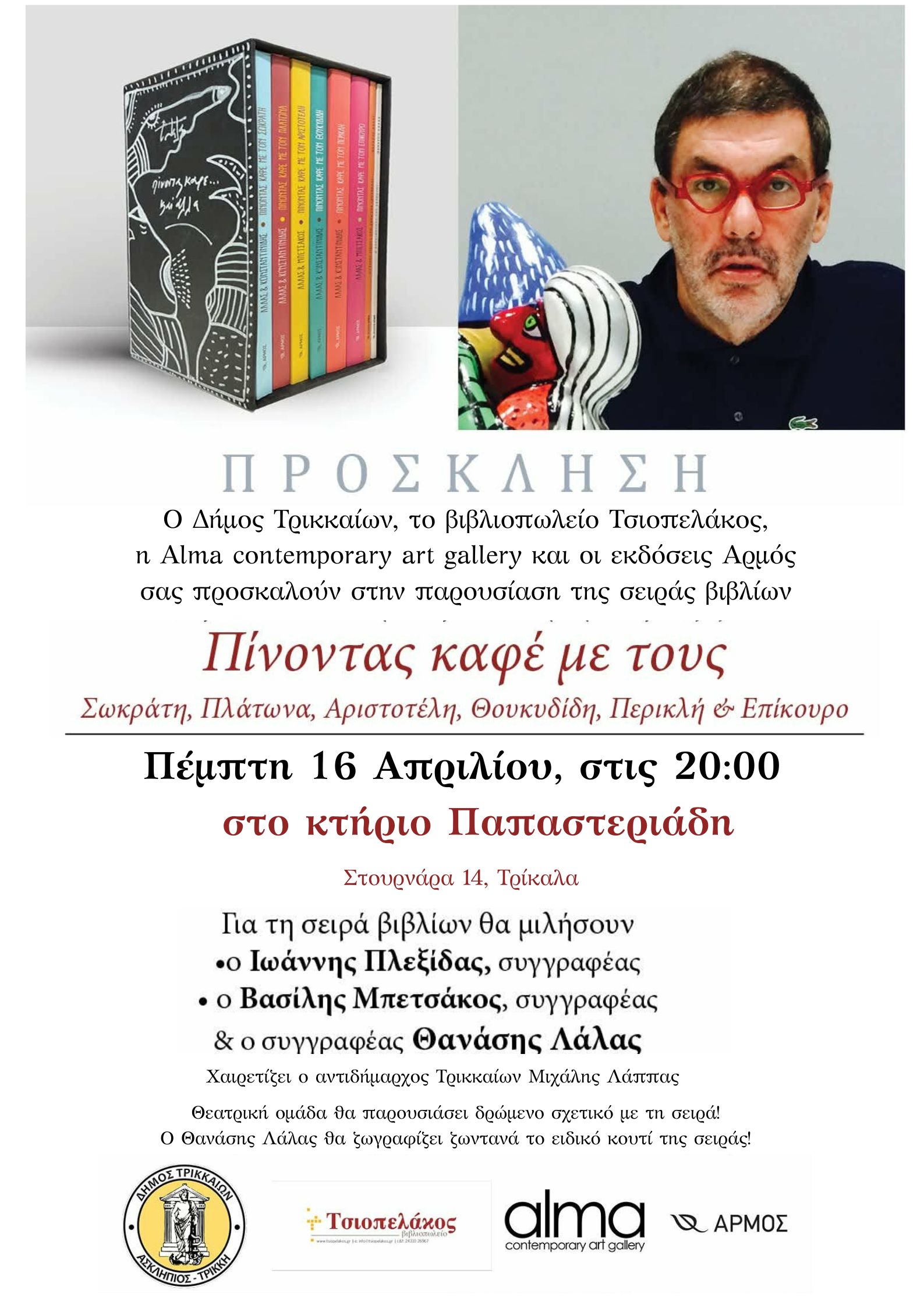 Ο Δήμος Τρικκαίων, το βιβλιοπωλείο Τσιοπελάκος, η Alma contemporary art gallery και οι εκδόσεις Αρμός διοργανώνουν παρουσίαση της σειράς βιβλίων «Πίνοντας καφέ με τους Σωκράτη, Πλάτωνα, Αριστοτέλη, Θουκυδίδη, Περικλή και Επίκουρο». Η εκδήλωση – δράση θα πραγματοποιηθεί την Πέμπτη 16 Απριλίου στις 20:00, στο κτήριο Παπαστεριάδη (Στουρνάρα 14, Τρίκαλα).
