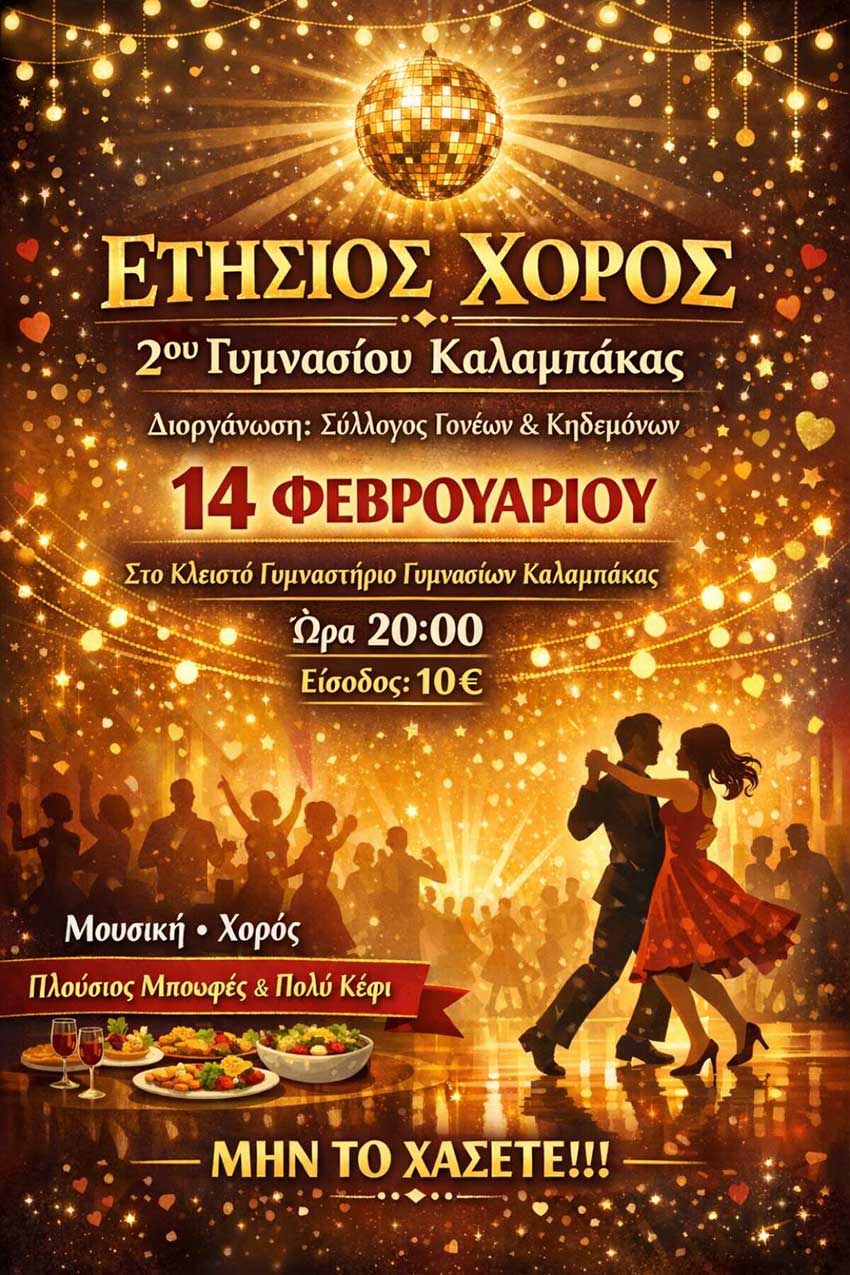 Ο Σύλλογος Γονέων και Κηδεμόνων του 2ου Γυμνασίου Καλαμπάκας σας προσκαλεί στον καθιερωμένο ετήσιο χορό του, που θα πραγματοποιηθεί το Σάββατο 14 Φεβρουαρίου 2026. Σε μια βραδιά γεμάτη λάμψη, μουσική και πολύ κέφι, μαθητές, γονείς και φίλοι δίνουν ραντεβού στο Κλειστό Γυμναστήριο Γυμνασίων Καλαμπάκας στις 20:00.