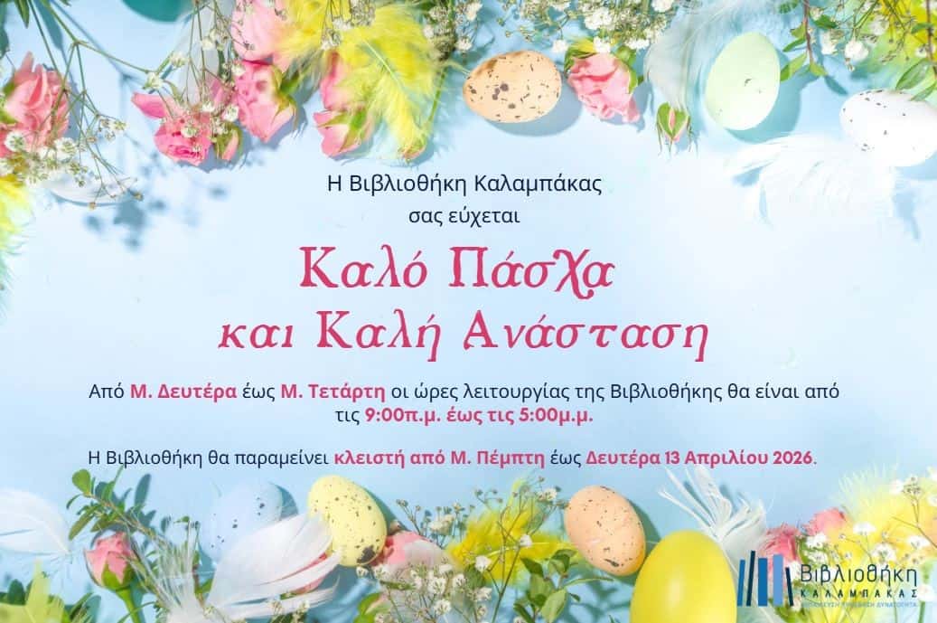 Η Βιβλιοθήκη ενημερώνει το κοινό ότι το ωράριο λειτουργίας κατά τη διάρκεια του Πάσχα θα διαμορφωθεί ως εξής:
