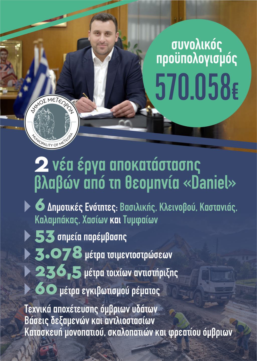 Υπογράφηκαν από τον Δήμαρχο Μετεώρων Λευτέρη Αβραμόπουλο δύο συμβάσεις που αφορούν έργα αποκατάστασης βλαβών από τη θεομηνία «Daniel» σε υποδομές του Δήμου Μετεώρων, συνολικού προϋπολογισμού 570.058 ευρώ. Με την υπογραφή των συμβάσεων, το επόμενο διάστημα ξεκινούν σημαντικά έργα στα χωριά του Δήμου, με παρεμβάσεις σε έξι Δημοτικές Ενότητες: Βασιλικής, Κλεινοβού, Καστανιάς, Καλαμπάκας, Χασίων και Τυμφαίων. Συνολικά προβλέπονται 53 σημεία παρέμβασης, που περιλαμβάνουν: